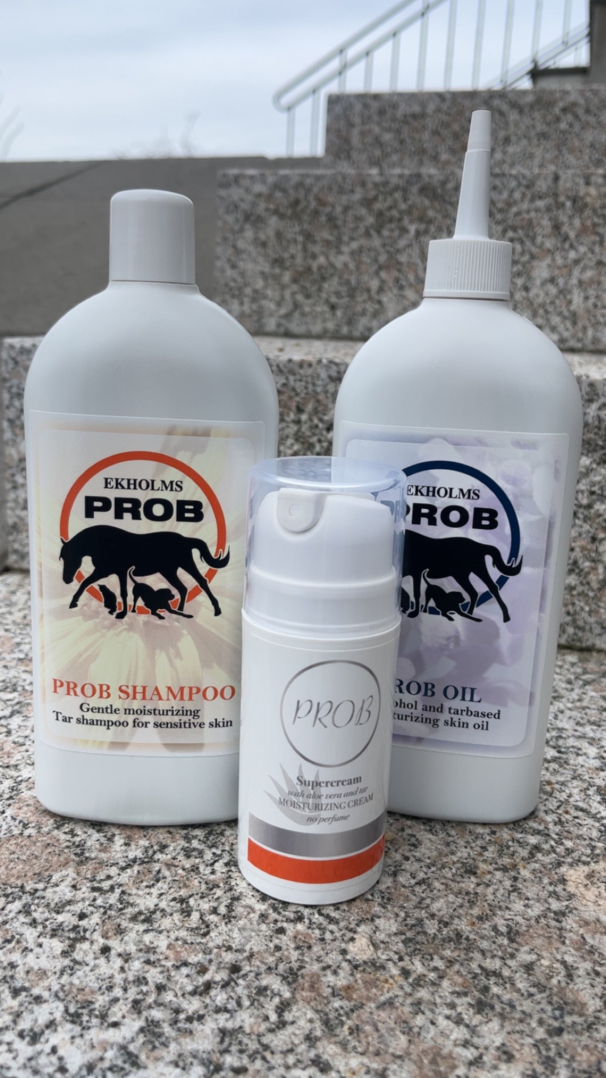 Pakken består av: 500 ML Prob Tjæresjampo, 500ML Prob Olje og 100 ML Prob Superkrem.