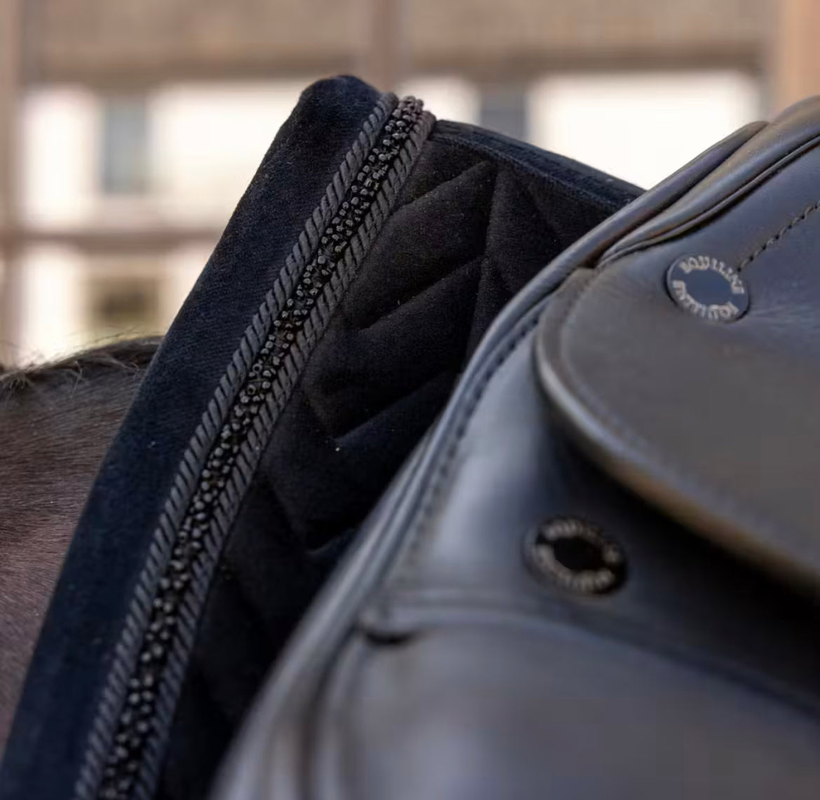 Et tidløst underlag for ryttere som setter pris på luksuriøse materialer og elegante detaljer. Sadelunderlaget er laget i eksklusivt fløyelsstoff med vår signatur fiskebensquilt, kombinert med et pustende fôr i bomull og polyester som effektivt absorberer svette.
