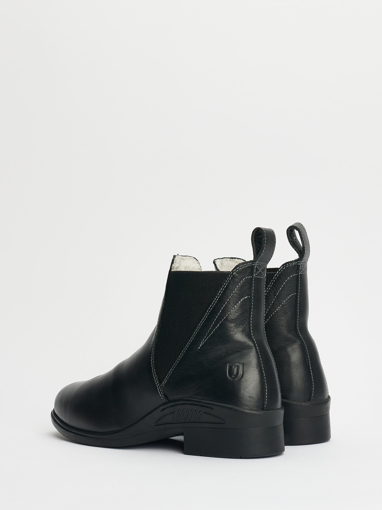 Jodhpur i lær med strikk på begge sider for god passform. Lærkledd innside, innersåle med ekstra høy komfort. Anti-slip gummisåle for bedre feste på glatte underlag. Lyse dekorsømmer.